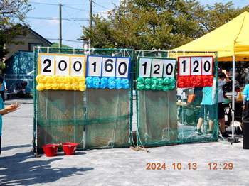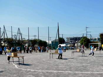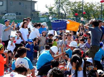 | 各チームの色に分かれたカゴに球を投げ入れます(赤・白どちらでもOK)。