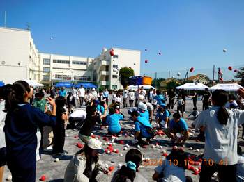 ②走者はフーセンを持って、③エプロン(←これがバトン)を着用し、④お尻でフーセンを割って戻るリレーです。 今年のカラー対抗の最後の種目です(頑張って!)。 |