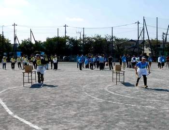 ③おたまに乗せて椅子を回ってゴールに戻るリレー競技です。 「参加賞」は今夜のおかずにど~ぞ? |